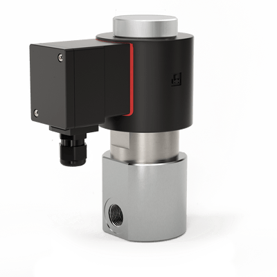 Electrovanne type 55 avec pièce en fer haute pression pour des pressions jusqu'à 450 bar. En position de repos, l'électrovanne est fermée par un ressort (NC). L'aimant alimenté en courant attire l'armature magnétique vers le noyau antagoniste contre l'effet de force du ressort. La vanne La vanne s'ouvre. Les vannes à commande directe de ce type ne nécessitent pas de pression différentielle. Ces vannes sont utilisées utilisées pour des débits plus faibles et des pressions de fluide élevées.